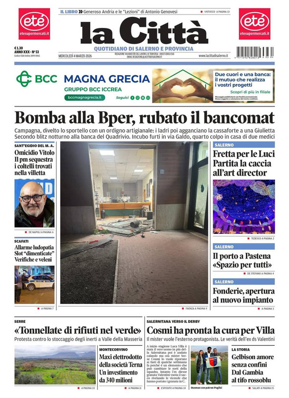 "Cosmi ha pronta la cura per Villa" titola il quotidiano La Città in edicola oggi sulla Salernitana. Il mister vuole l'esterno protagonista poi spazio alle parole dell'ex ds Valentini che racconta la propria verità.