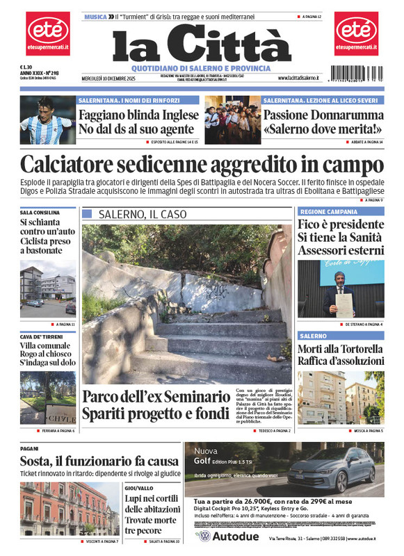 "Faggiano blinda Inglese, no dal ds al suo agente" titola il quotidiano La Città in edicola oggi sulla Salernitana e sul mercato con i nomi dei primi rinforzi. Poi spazio all'incontro tenutosi al Liceo Severi dove è intervenuto anche il portiere Donnarumma che ha dichiarato: "Salerno dove merita!".