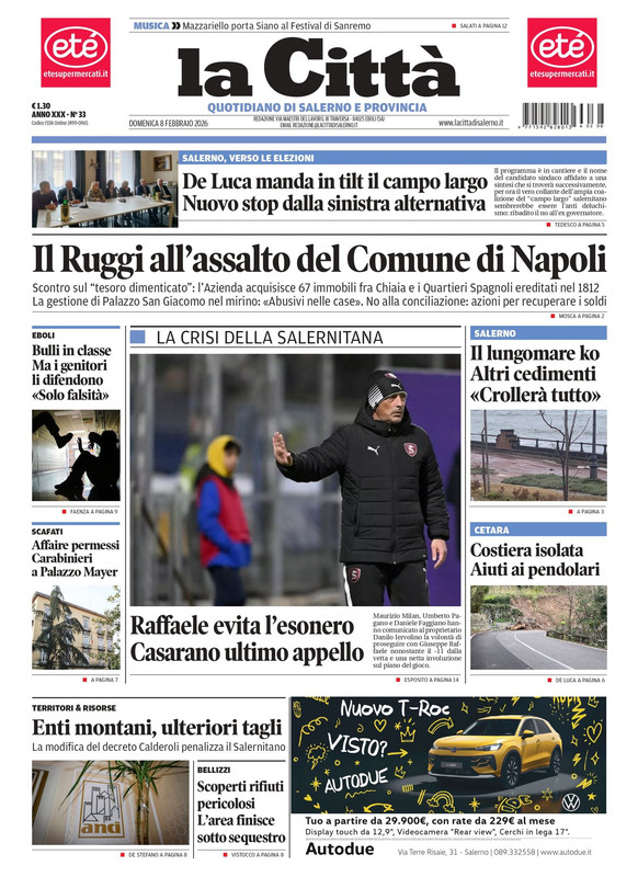 "Raffaele evita l'esonero, Casarano ultimo appello" titola il quotidiano La Città in edicola oggi sulla crisi della Salernitana, dopo il ko con il Cerignola.