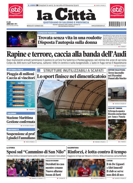 "Rinforzi, è lotta contro il tempo" titola il quotidiano La Città in edicola oggi sulla Salernitana. Faggiano stringe per Meazzi e Chiricò. Poi spazio alla sfida al Cosenza con la carica di Raffaele.