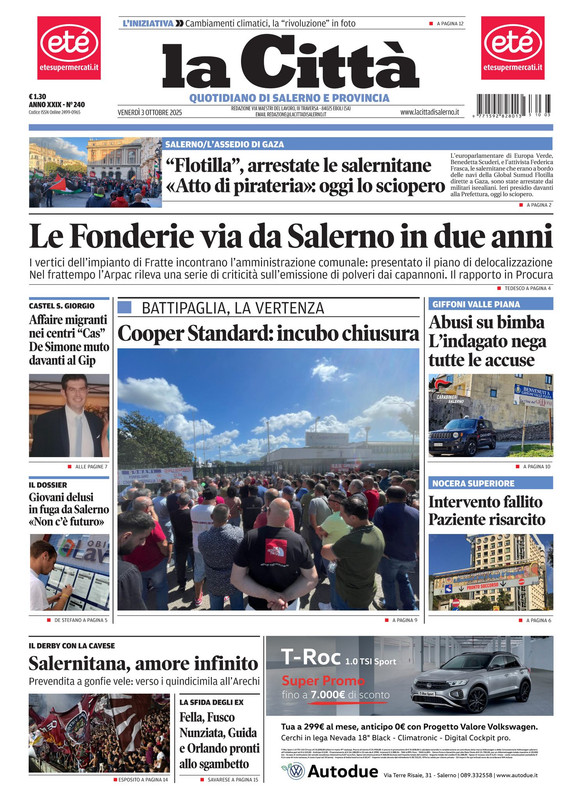 Nell'edizione odierna del quotidiano 'La Città' si parla del derby tra Salernitana e Cavese. "Amore infinito" titola il giornale sulla prevendita che va a gonfie vele: si va verso i quindicimila all'Arechi. Intanto per quanto riguarda i metelliani c'è la sfida degli ex Fella, Fusco, Nunziata, Guida e Orlando pronti allo sgambetto.